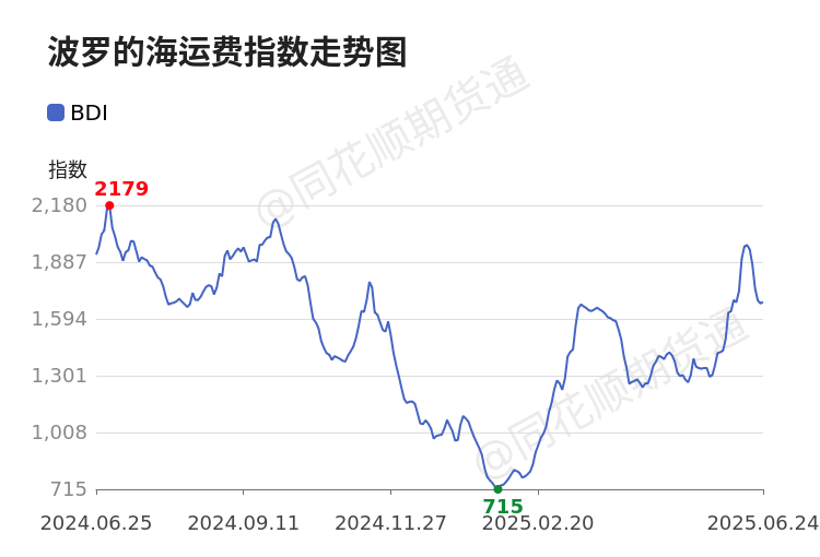 BDI6月24日已涨至1681.00,当日涨幅0.42%,周跌幅13.88%,月涨幅25.45%。