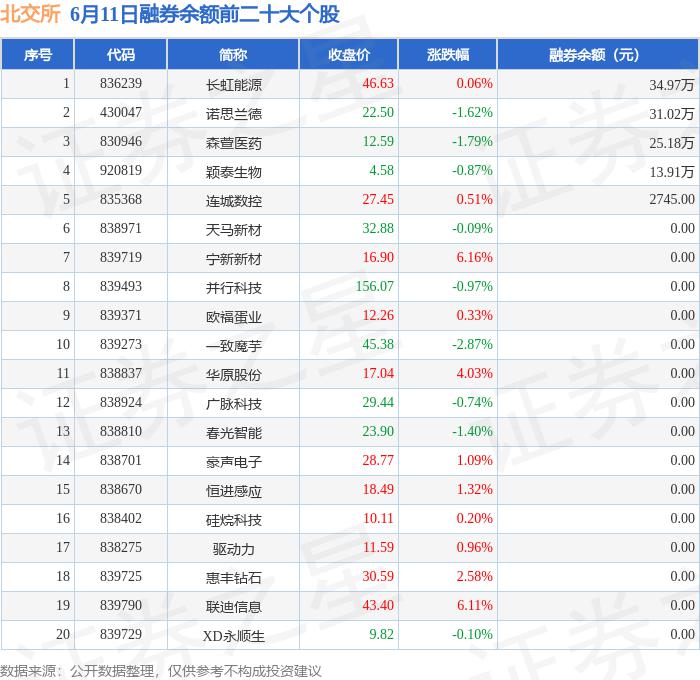 北交所融券余额前三分别为:长虹能源(836239)融券余额34.97万元、诺思兰德(430047)融券余额31.02万元、森萱医药(830946)融券余额25.18万元,前20具体见下表: