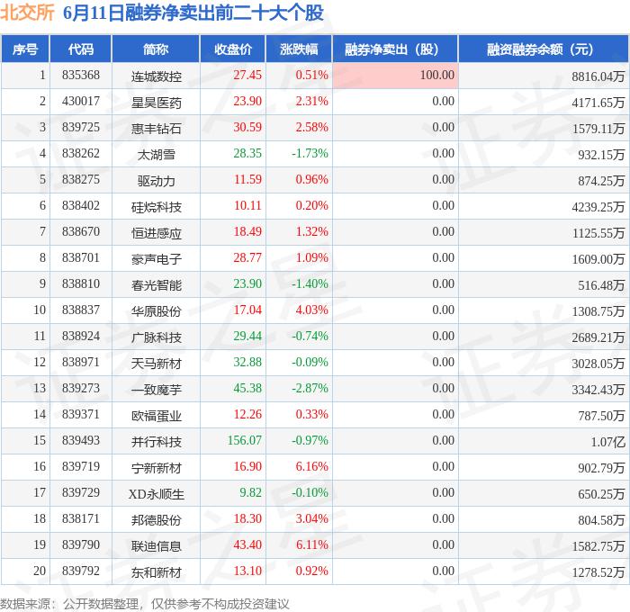 北交所融券净卖出前三分别为:连城数控(835368)融券净卖出100股,前20具体见下表:
